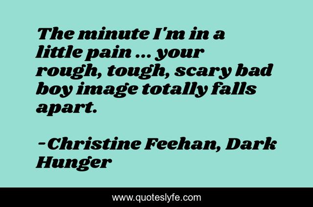 This page presents the quote "The minute I'm in a little pain ... your rough, tough, scary bad boy image totally falls apart.". Author of this quote is Christine Feehan, Dark Hunger. This quote is about romance, bad-boy, pain, carpathians,.