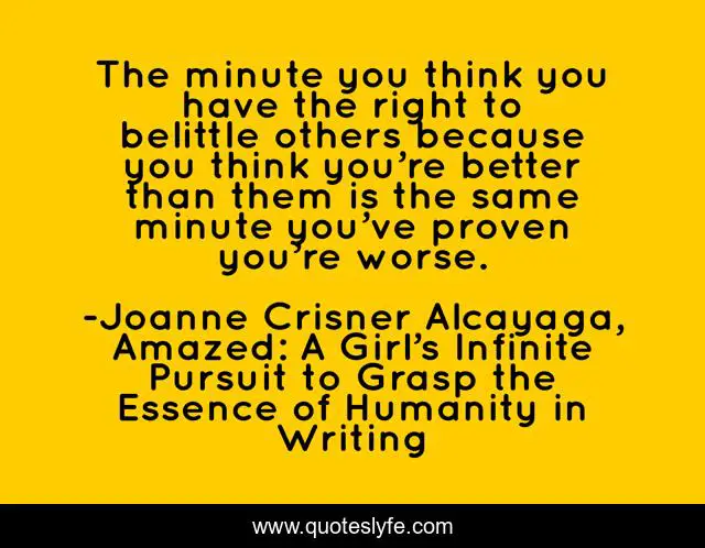 This page presents the quote "The minute you think you have the right to belittle others because you think you’re better than them is the same minute you’ve proven you’re worse.". Author of this quote is Joanne Crisner Alcayaga, Amazed: A Girl’s Infinite Pursuit to Grasp the Essence of Humanity in Writing. This quote is about amazed, humility,.