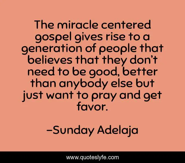 This page presents the quote "The miracle centered gospel gives rise to a generation of people that believes that they don’t need to be good, better than anybody else but just want to pray and get favor.". Author of this quote is Sunday Adelaja. This quote is about miracles, prayers, generation, people, favour, miracle-centered-gospel, beliefs,.
