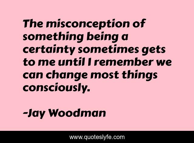 This page presents the quote "The misconception of something being a certainty sometimes gets to me until I remember we can change most things consciously.". Author of this quote is Jay Woodman. This quote is about consciously, philosophy, certainty, uncertainty, consciously-decide, change,.