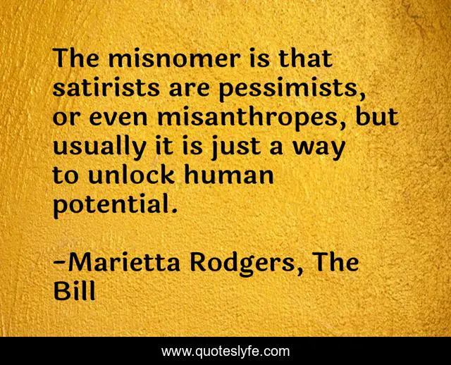 This page presents the quote "The misnomer is that satirists are pessimists, or even misanthropes, but usually it is just a way to unlock human potential.". Author of this quote is Marietta Rodgers, The Bill. This quote is about writing-life, satire, writing,.