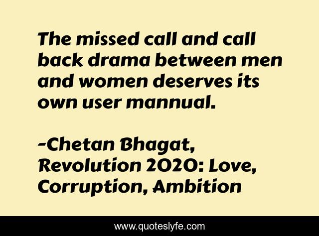 This page presents the quote "The missed call and call back drama between men and women deserves its own user mannual.". Author of this quote is Chetan Bhagat, Revolution 2020: Love, Corruption, Ambition. This quote is about drama, sweet-love,.