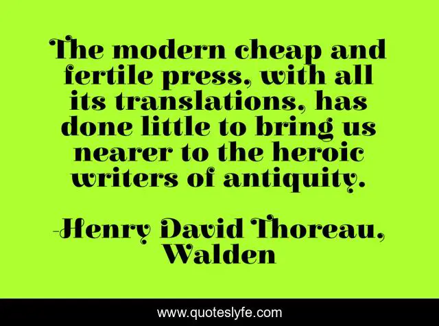 This page presents the quote "The modern cheap and fertile press, with all its translations, has done little to bring us nearer to the heroic writers of antiquity.". Author of this quote is Henry David Thoreau, Walden. This quote is about mass-culture, translations, cheapness, writing, books, authenticity, press, mass-media, classics,.