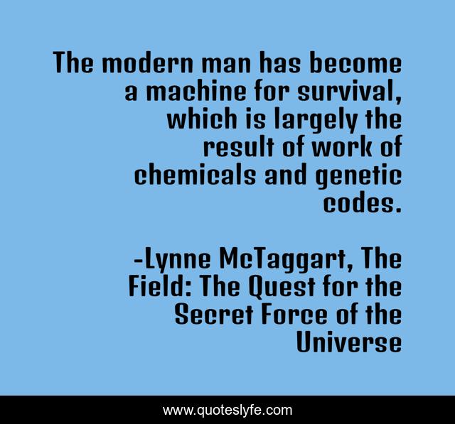 This page presents the quote "The modern man has become a machine for survival, which is largely the result of work of chemicals and genetic codes.". Author of this quote is Lynne McTaggart, The Field: The Quest for the Secret Force of the Universe. .