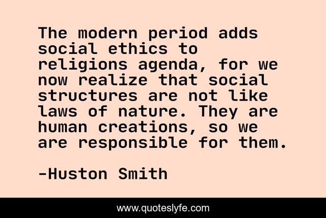This page presents the quote "The modern period adds social ethics to religions agenda, for we now realize that social structures are not like laws of nature. They are human creations, so we are responsible for them.". Author of this quote is Huston Smith. This quote is about ethics, realize, human,.