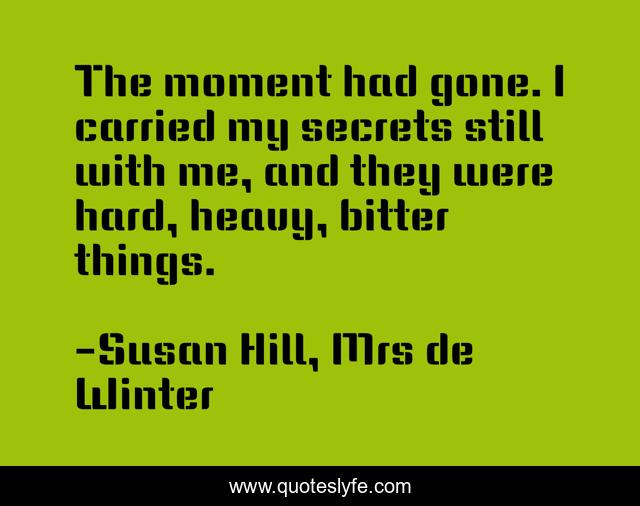 This page presents the quote "The moment had gone. I carried my secrets still with me, and they were hard, heavy, bitter things.". Author of this quote is Susan Hill, Mrs de Winter. .