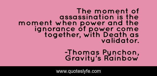 This page presents the quote "The moment of assassination is the moment when power and the ignorance of power come together, with Death as validator.". Author of this quote is Thomas Pynchon, Gravity's Rainbow. This quote is about assassination, deception, power,.