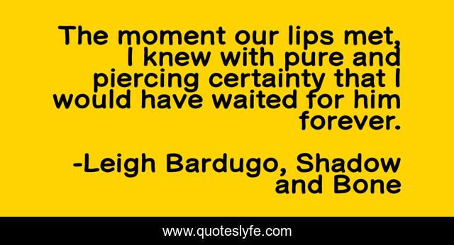 This page presents the quote "The moment our lips met, I knew with pure and piercing certainty that I would have waited for him forever.". Author of this quote is Leigh Bardugo, Shadow and Bone. This quote is about alina, love, affection,.