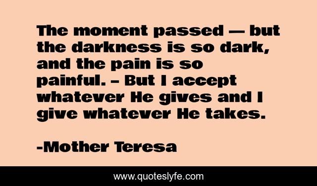 This page presents the quote "The moment passed — but the darkness is so dark, and the pain is so painful. – But I accept whatever He gives and I give whatever He takes.". Author of this quote is Mother Teresa. This quote is about dark, god, acceptance, pain, darkness,.