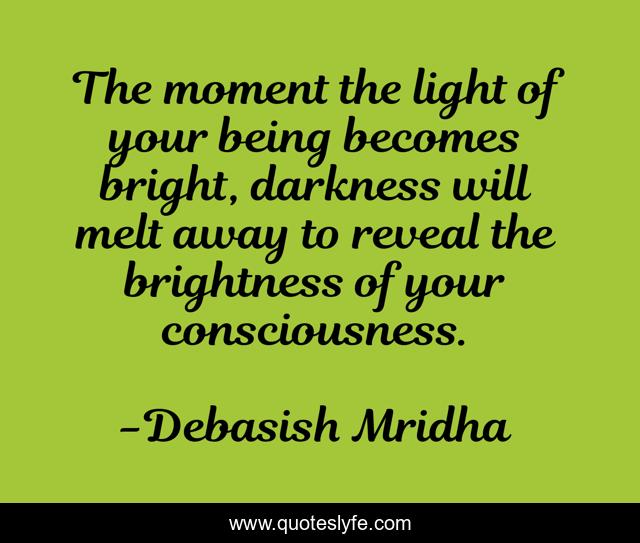 This page presents the quote "The moment the light of your being becomes bright, darkness will melt away to reveal the brightness of your consciousness.". Author of this quote is Debasish Mridha. This quote is about darkness, consciousness, philosophy, debasish-mridha, quotes, inspirational, enthusiasm, debasish-mridha-m-d, brightness-of-your-consciousness,.