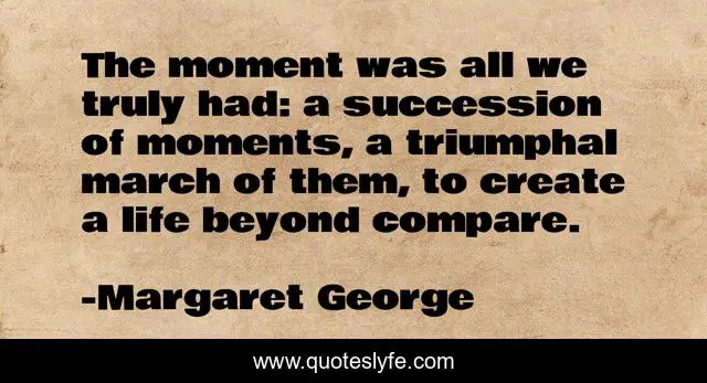 This page presents the quote "The moment was all we truly had: a succession of moments, a triumphal march of them, to create a life beyond compare.". Author of this quote is Margaret George. This quote is about mythology, historical-fiction,.