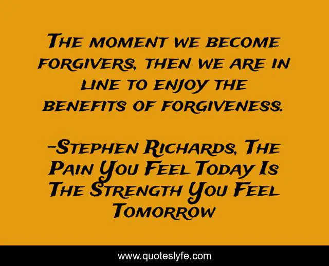 This page presents the quote "The moment we become forgivers, then we are in line to enjoy the benefits of forgiveness.". Author of this quote is Stephen Richards, The Pain You Feel Today Is The Strength You Feel Tomorrow. This quote is about empowering, confidence, moving-on-and-letting-go, healing-the-past, motivational, forgive, stephen-richards-author, stephen-richards, suffering,.