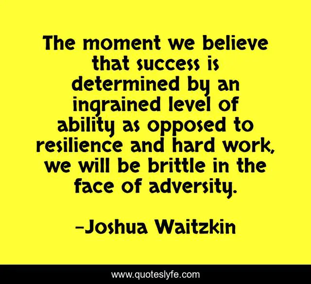 This page presents the quote "The moment we believe that success is determined by an ingrained level of ability as opposed to resilience and hard work, we will be brittle in the face of adversity.". Author of this quote is Joshua Waitzkin. This quote is about success, hard work,.