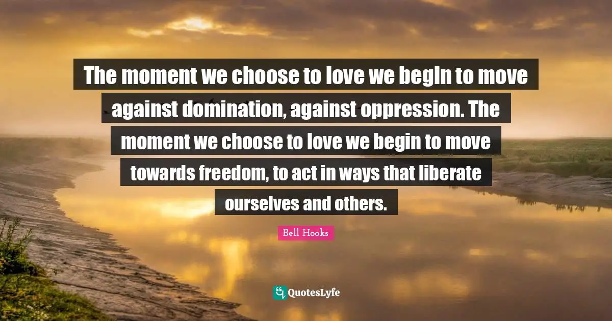 This page presents the quote "The moment we choose to love we begin to move against domination, against oppression. The moment we choose to love we begin to move towards freedom, to act in ways that liberate ourselves and others.". Author of this quote is Bell Hooks. This quote is about domination, way, affection, oppression, freedom, love, moving,.