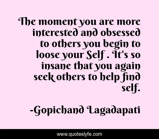 This page presents the quote "The moment you are more interested and obsessed to others you begin to loose your Self . It's so insane that you again seek others to help find self.". Author of this quote is Gopichand Lagadapati. .