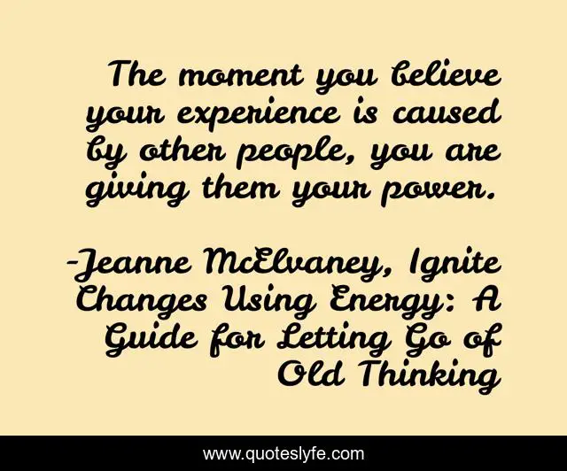 This page presents the quote "The moment you believe your experience is caused by other people, you are giving them your power.". Author of this quote is Jeanne McElvaney, Ignite Changes Using Energy: A Guide for Letting Go of Old Thinking. This quote is about energy, change-your-life, inspiration, personal-growth,.