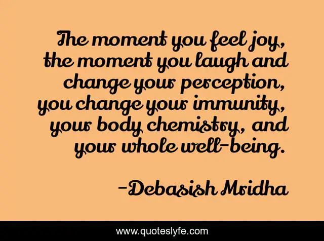 This page presents the quote "The moment you feel joy, the moment you laugh and change your perception, you change your immunity, your body chemistry, and your whole well-being.". Author of this quote is Debasish Mridha. This quote is about debasish, joy, philosophy, debasish-mridha, moment, change-your-well-being, laugh, mridha, change-your-perception,.