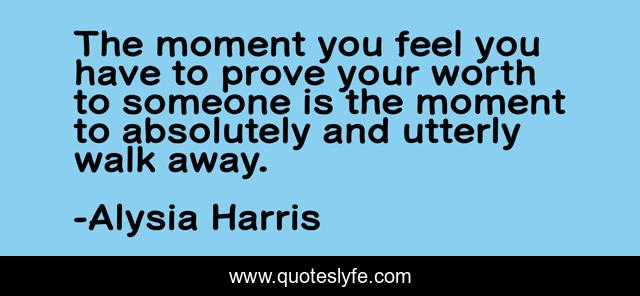 This page presents the quote "The moment you feel you have to prove your worth to someone is the moment to absolutely and utterly walk away.". Author of this quote is Alysia Harris. This quote is about bad-people, worth, self-worth,.