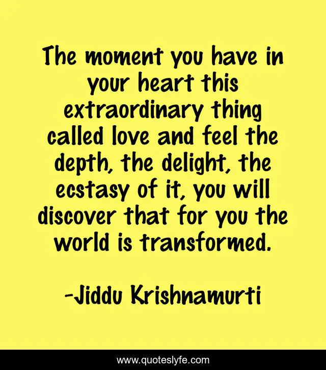 This page presents the quote "The moment you have in your heart this extraordinary thing called love and feel the depth, the delight, the ecstasy of it, you will discover that for you the world is transformed.". Author of this quote is Jiddu Krishnamurti. This quote is about heart, moment, world,.