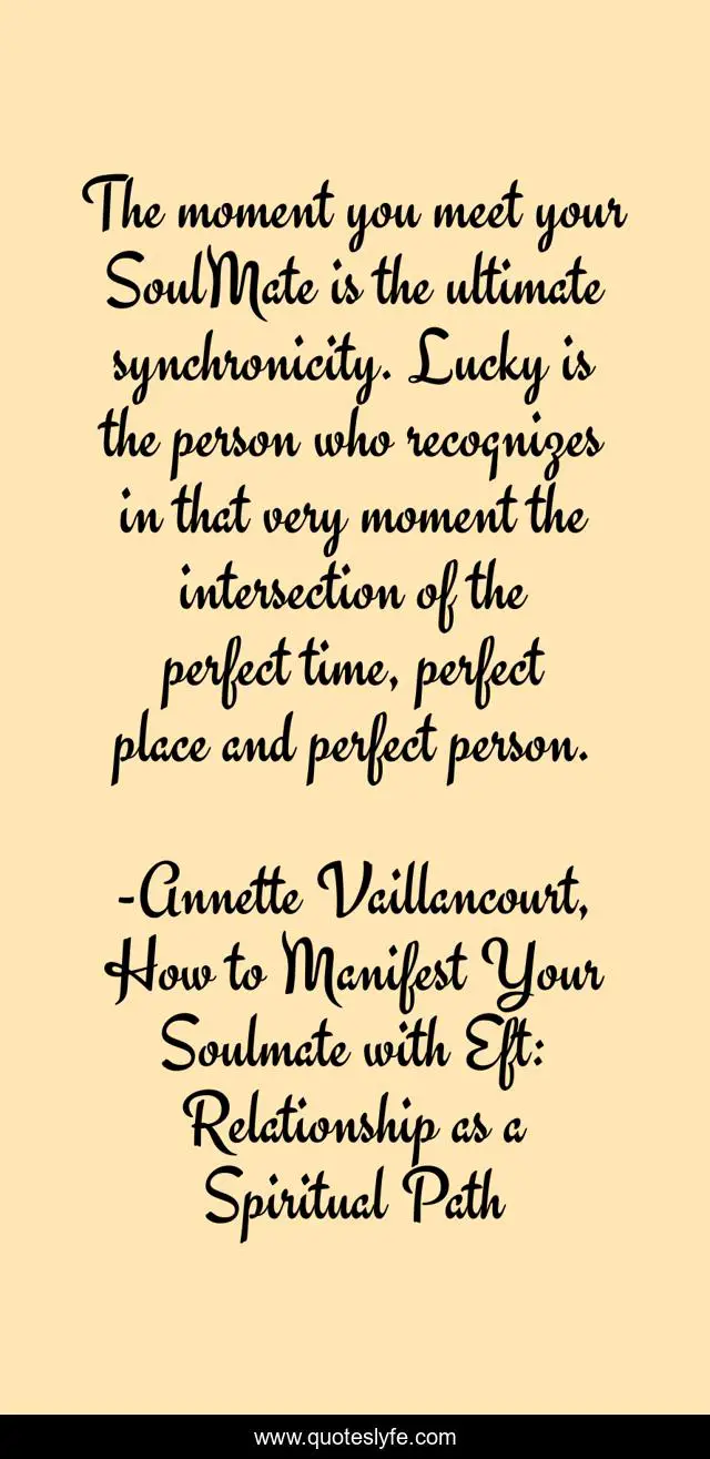 This page presents the quote "The moment you meet your SoulMate is the ultimate synchronicity. Lucky is the person who recognizes in that very moment the intersection of the perfect time, perfect place and perfect person.". Author of this quote is Annette Vaillancourt, How to Manifest Your Soulmate with Eft: Relationship as a Spiritual Path. This quote is about soulmate, synchronicity,.