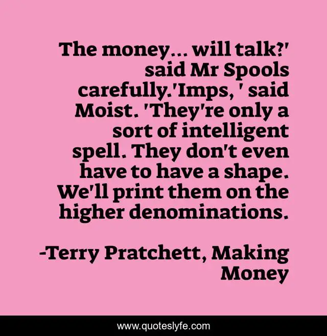 This page presents the quote "The money… will talk?' said Mr Spools carefully.'Imps, ' said Moist. 'They're only a sort of intelligent spell. They don't even have to have a shape. We'll print them on the higher denominations.". Author of this quote is Terry Pratchett, Making Money. This quote is about money, magical,.