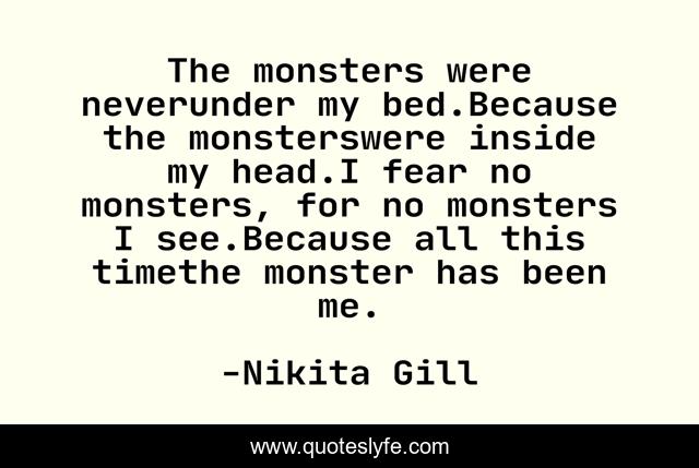This page presents the quote "The monsters were neverunder my bed.Because the monsterswere inside my head.I fear no monsters, for no monsters I see.Because all this timethe monster has been me.". Author of this quote is Nikita Gill. This quote is about poem, life, monster, depressed, insomnia, poetry, sad, sadness, sleep,.