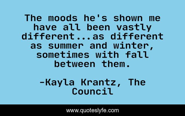 This page presents the quote "The moods he's shown me have all been vastly different...as different as summer and winter, sometimes with fall between them.". Author of this quote is Kayla Krantz, The Council. This quote is about summer, fall, winter, mood,.