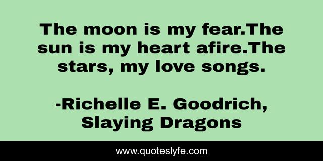 This page presents the quote "The moon is my fear.The sun is my heart afire.The stars, my love songs.". Author of this quote is Richelle E. Goodrich, Slaying Dragons. This quote is about heart, poem, richelle-e-goodrich, poetry, richelle, haiku, poet, richelle-goodrich, fear,.