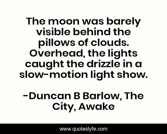 This page presents the quote "The moon was barely visible behind the pillows of clouds. Overhead, the lights caught the drizzle in a slow-motion light show.". Author of this quote is Duncan B Barlow, The City, Awake. This quote is about beautiful, beauty-of-nature-language, nature, inspirational, enthusiasm,.
