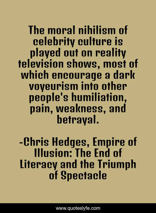 "Chris Hedges, Empire of Illusion: The End of Literacy and the Triumph of Spectacle Quotes." Quoteslyfe.com, 2025. Mon. 08 Dec. 2025. <https://www.quoteslyfe.com/quote/The-moral-nihilism-of-celebrity-culture-is-161193>.
