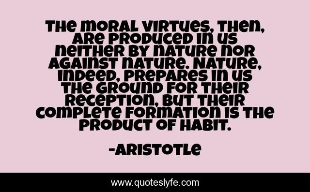 This page presents the quote "The moral virtues, then, are produced in us neither by nature nor against nature. Nature, indeed, prepares in us the ground for their reception, but their complete formation is the product of habit.". Author of this quote is Aristotle. This quote is about product, moral, habit,.