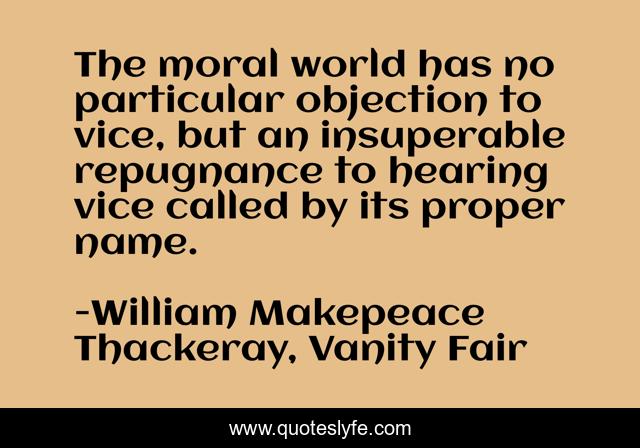 This page presents the quote "The moral world has no particular objection to vice, but an insuperable repugnance to hearing vice called by its proper name.". Author of this quote is William Makepeace Thackeray, Vanity Fair. This quote is about bigotry, dishonesty, morality, double-standards, vice,.