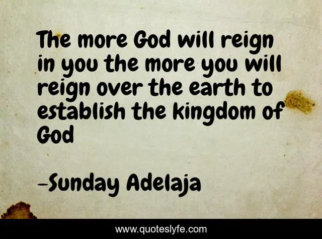 This page presents the quote "The more God will reign in you the more you will reign over the earth to establish the kingdom of God". Author of this quote is Sunday Adelaja. This quote is about kingdom, god, reign, earth, establish, more,.