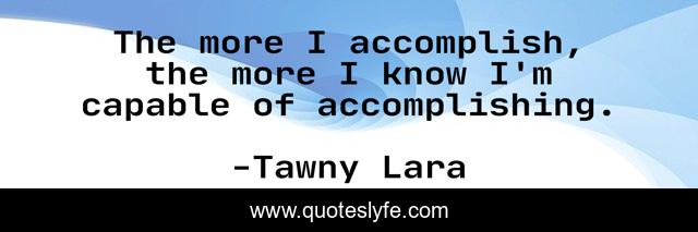 This page presents the quote "The more I accomplish, the more I know I'm capable of accomplishing.". Author of this quote is Tawny Lara. This quote is about capability, bhag, accomplish, goals-in-life, life-goals, accomplishment, lululemon, accomplishments, goals,.