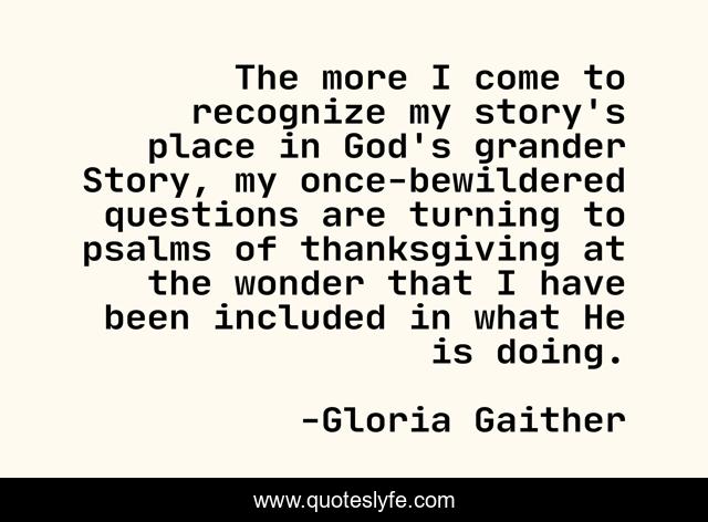 This page presents the quote "The more I come to recognize my story's place in God's grander Story, my once-bewildered questions are turning to psalms of thanksgiving at the wonder that I have been included in what He is doing.". Author of this quote is Gloria Gaither. This quote is about god, story, questions,.