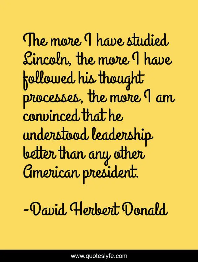 This page presents the quote "The more I have studied Lincoln, the more I have followed his thought processes, the more I am convinced that he understood leadership better than any other American president.". Author of this quote is David Herbert Donald. This quote is about thought, american,.