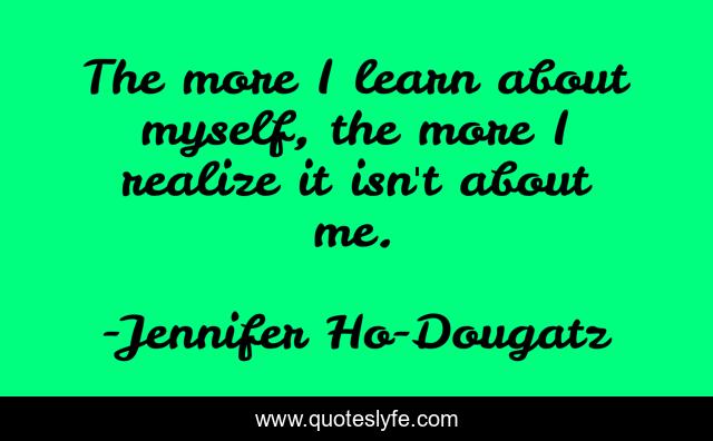 This page presents the quote "The more I learn about myself, the more I realize it isn't about me.". Author of this quote is Jennifer Ho-Dougatz. This quote is about lessons, life, self-awareness, positive, motivational, confidence, entrepreneur, optimistic, realization,.