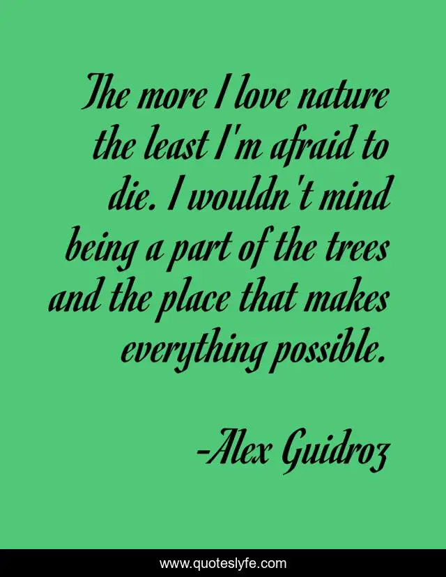 This page presents the quote "The more I love nature the least I'm afraid to die. I wouldn't mind being a part of the trees and the place that makes everything possible.". Author of this quote is Alex Guidroz. This quote is about acceptance, suicide, nature-s-beauty, metal-illness,.