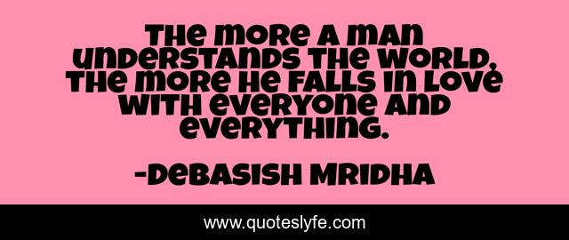 This page presents the quote "The more a man understands the world, the more he falls in love with everyone and everything.". Author of this quote is Debasish Mridha. This quote is about love, understand-the-world, philosophy, debasish-mridha, quotes, debasish-mridha-md, inspirational, enthusiasm, fall-in-love-with-everything,.