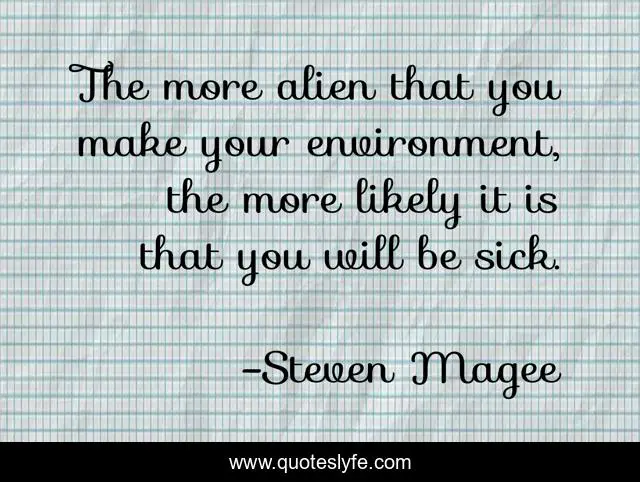 This page presents the quote "The more alien that you make your environment, the more likely it is that you will be sick.". Author of this quote is Steven Magee. This quote is about alien, make, environment, likely, sick, more,.