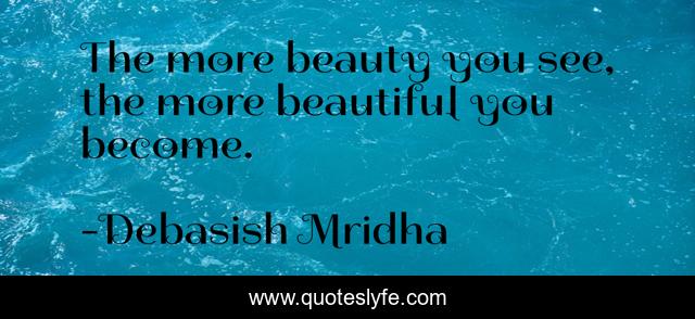 This page presents the quote "The more beauty you see, the more beautiful you become.". Author of this quote is Debasish Mridha. This quote is about beautiful, more-beautiful-you-become, beauty, philosophy, debasish-mridha, quotes, inspirational, the-more-beauty-you-see, enthusiasm,.