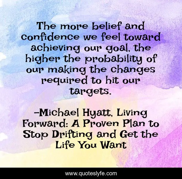 This page presents the quote "The more belief and confidence we feel toward achieving our goal, the higher the probability of our making the changes required to hit our targets.". Author of this quote is Michael Hyatt, Living Forward: A Proven Plan to Stop Drifting and Get the Life You Want. This quote is about confidence, belief, life-plan, goals, personal-development, intentional-living, change,.