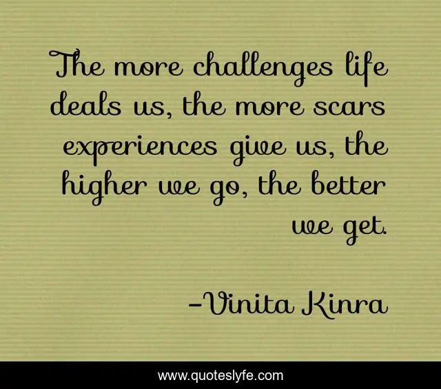This page presents the quote "The more challenges life deals us, the more scars experiences give us, the higher we go, the better we get.". Author of this quote is Vinita Kinra. This quote is about inspirational-life, enthusiasm, inspirational,.