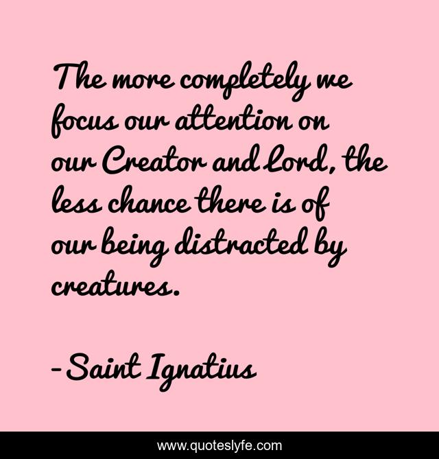 This page presents the quote "The more completely we focus our attention on our Creator and Lord, the less chance there is of our being distracted by creatures.". Author of this quote is Saint Ignatius. This quote is about distracted, focus, attention,.