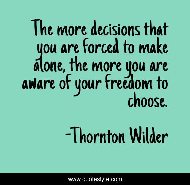 This page presents the quote "The more decisions that you are forced to make alone, the more you are aware of your freedom to choose.". Author of this quote is Thornton Wilder. This quote is about freedom, decisions,.