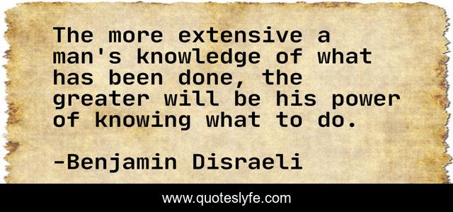 This page presents the quote "The more extensive a man's knowledge of what has been done, the greater will be his power of knowing what to do.". Author of this quote is Benjamin Disraeli. This quote is about done, power, man,.