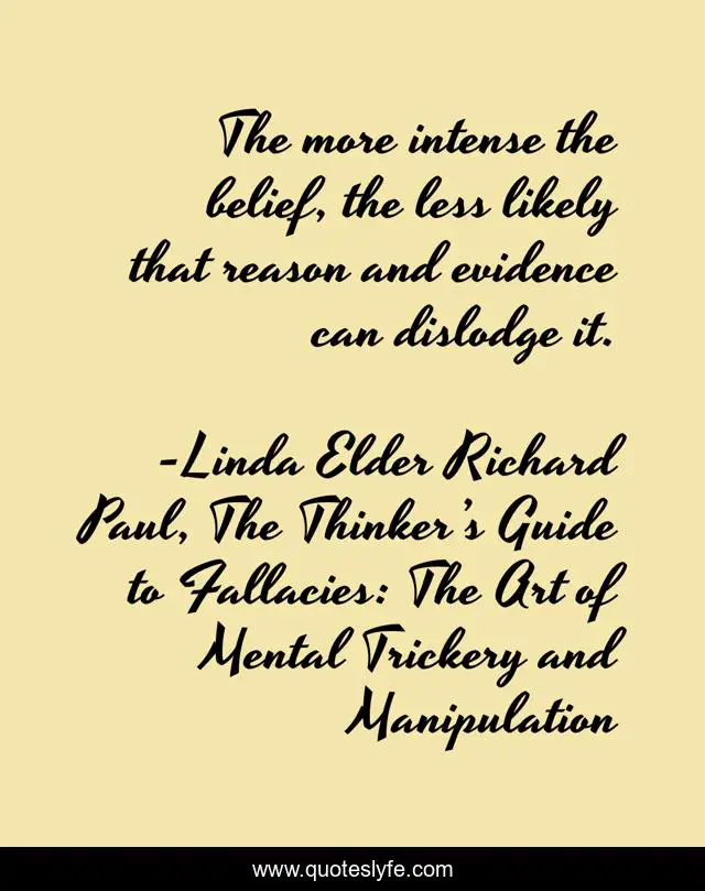 "Linda Elder Richard Paul, The Thinker’s Guide to Fallacies: The Art of Mental Trickery and Manipulation Quotes." Quoteslyfe.com, 2025. Fri. 05 Dec. 2025. <https://www.quoteslyfe.com/quote/The-more-intense-the-belief-the-less-111037>.