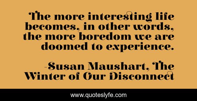 This page presents the quote "The more interesting life becomes, in other words, the more boredom we are doomed to experience.". Author of this quote is Susan Maushart, The Winter of Our Disconnect. This quote is about media, boredeom, leisure,.