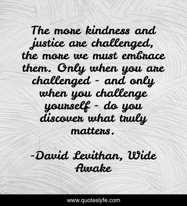 "David Levithan, Wide Awake Quotes." Quoteslyfe.com, 2025. Sat. 06 Dec. 2025. <https://www.quoteslyfe.com/quote/The-more-kindness-and-justice-are-challenged-236300>.