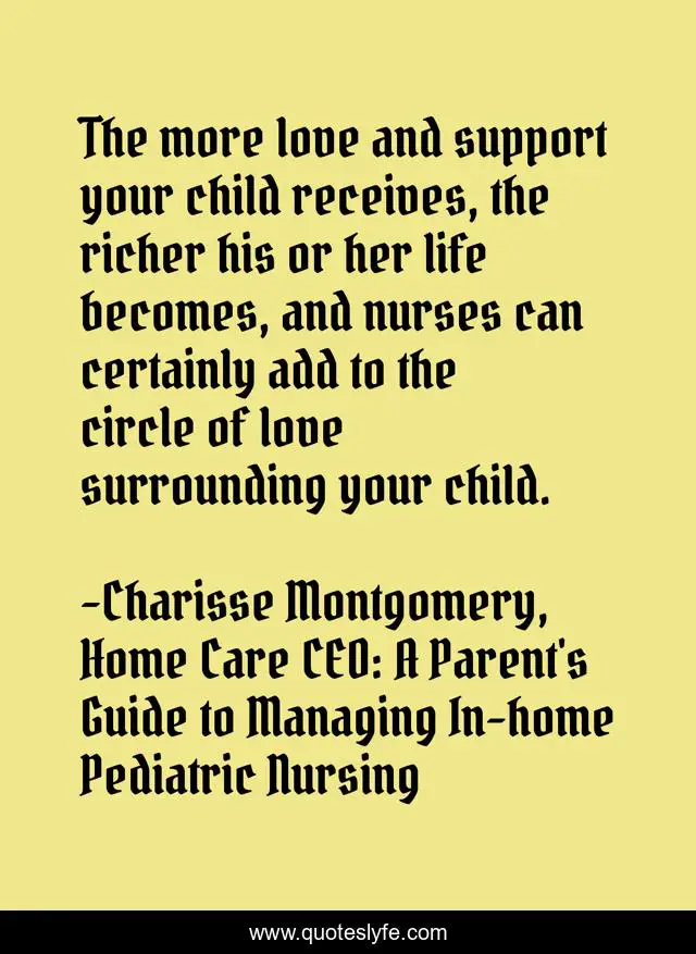 This page presents the quote "The more love and support your child receives, the richer his or her life becomes, and nurses can certainly add to the circle of love surrounding your child.". Author of this quote is Charisse Montgomery, Home Care CEO: A Parent's Guide to Managing In-home Pediatric Nursing. This quote is about home, nurse, special-needs, parenting, disability,.